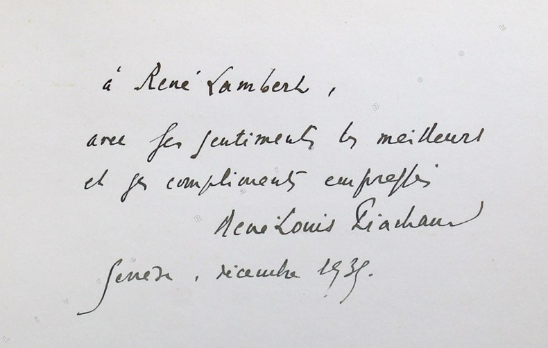 Illustré d'un portrait de l'auteur par Baldo Guiberti. Édition originale de la traduction française, précédé d'un avant dire de René-Louis Piachaud. Tiré à 400 exemplaires numérotés (223). Avec un bel envoi "au si cher Henry Spiess, en très affectueux témoignage d'admiration et de reconnaissance René-Louis Piachaud. Et que 1939, cher Prince, te soit favorable! 19 janvier 1939". De la bibliothèque de Théophile Bringolf, avec son ex-libris, cet exemplaire a figuré dans le catalogue rédigé en 1981 par Maurice Bridel - "Quelques écrivains suisses romands du XVIIIe au XXe", sous le n° 345, alors au prix de 100 chf. Bel exemplaire.